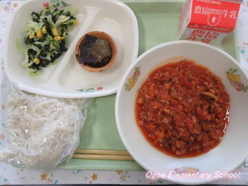 スパゲッティ麺、ミートソース、ほうれん草サラダ、手作りチョコタルト、牛乳です。