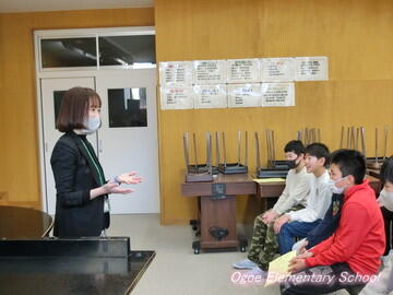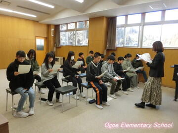 初めて卒業式に参加する5年生は、式歌の練習が始まりました。今日は、市教育委員会より白岩指導主事にお越しいただき、歌唱の指導をしていただきました。姿勢や口の開き方など歌の基本から丁寧に教えていただきました。