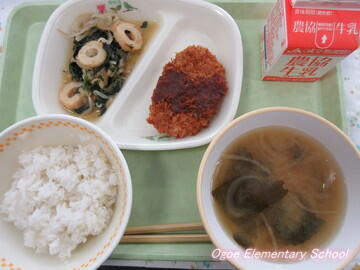 麦ごはん、味噌カツ、玉ねぎの味噌汁、牛乳です。