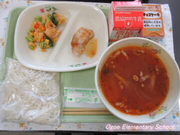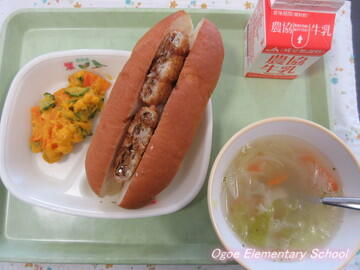 12月最後の給食は、ドッグパン、メンチカツ、かぼちゃサラダ、アルファベットスープ、パックソース、牛乳でした。
