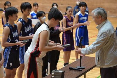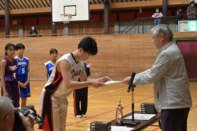 その後、県大会のシード順位を決める試合を、同じく決勝進出を逃した郡山六中と行いました。この試合もまさしく一進一退の展開。しかし今日は一人一人の集中力が違いました。最終的には58対51で勝利!県中地区で3番目のシード権を獲得しました。また、今大会の優秀選手賞をキャプテンの田中さんが受賞しました。おめでとうございます。
