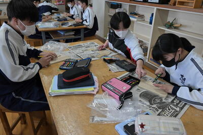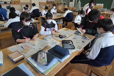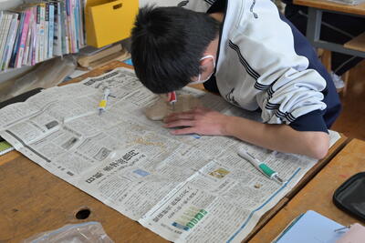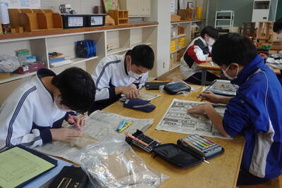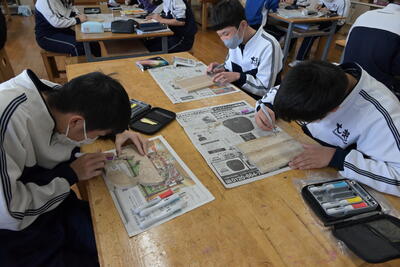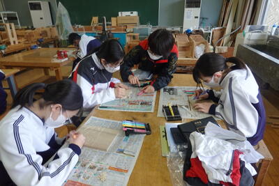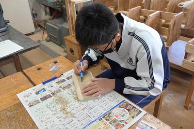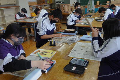 2024年2月1日 17時20分2年生の美術では、表札ボードの制作に取り組んでいます。現在は、加工と彫刻の作業を行っていて、外側の形を工夫したり、凹凸や高低差を意識したりしながら制作を進めています。中には、彫刻刀の彫り跡を生かす工夫をしている生徒もいました。独創的な表札が出来上がりそうで、楽しみです。