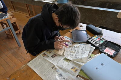 2年生の美術では、表札ボードの制作に取り組んでいます。現在は、加工と彫刻の作業を行っていて、外側の形を工夫したり、凹凸や高低差を意識したりしながら制作を進めています。中には、彫刻刀の彫り跡を生かす工夫をしている生徒もいました。独創的な表札が出来上がりそうで、楽しみです。