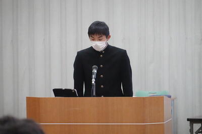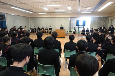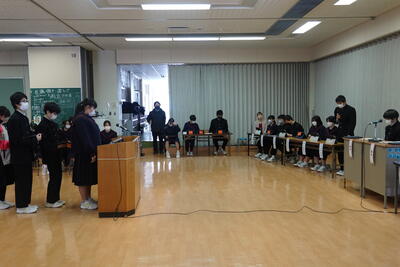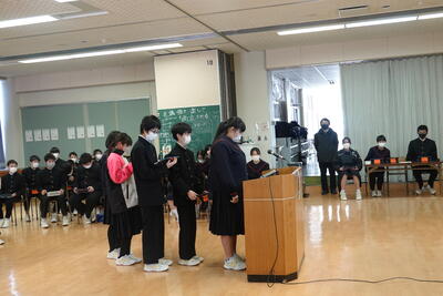 これまで準備してきた生徒会本部役員、各専門委員会の委員長、各部活動の部長の皆さん、大変お疲れさまでした。今後も、自分たちの学校生活を自分たちの手でよりよくしていく取組に期待しています。