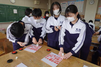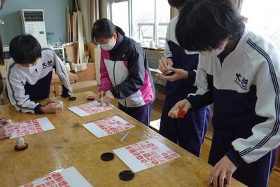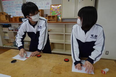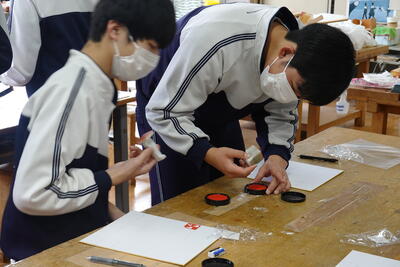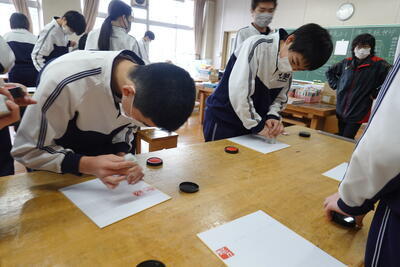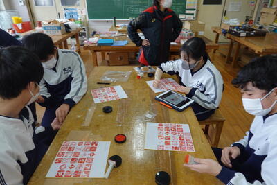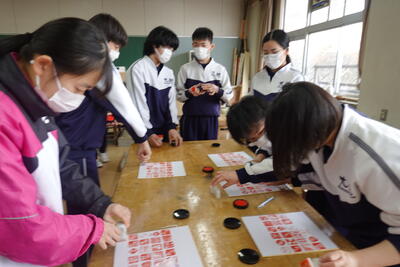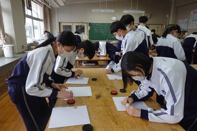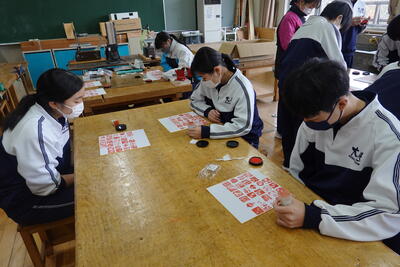 3年生の美術では篆刻に取り組んでいましたが、いよいよ完成しました。本日は、一人一人の色紙に全員が押印しました。全員分の印影が揃うと、それぞれの個性がでていて面白いと思いました。卒業記念にもなる素敵なプレゼントになりました!