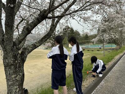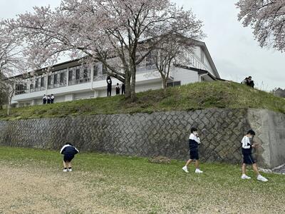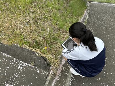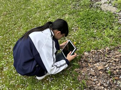 2024年4月18日 15時00分本日、1年生の理科の授業では、身のまわりの生物の観察を行いました。校庭に出て、ルーペを使って観察したり、生物を観察して気づいたことをロイロノートでまとめたりしました。