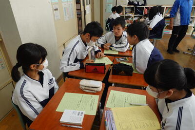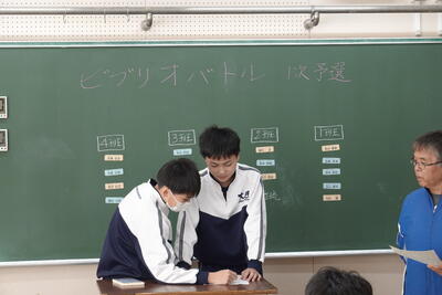 2024年10月31日 17時30分昨日からスタートした令和6年度の校内ビブリオバトルの予選。本日は、1年生と2年生が行いました。1年生にとては初めてのビブリオバトルだったため、戸惑いながらも一生懸命取り組んでいました。予選は4~5名の班ごとに、本の紹介に4分間、その後のディスカッションに2分間の時間を設定して行いましたが、時間も持て余してしまうことも多かったようです。この後も予選、本選と続くので、経験しながら学んでいってほしいと思います。