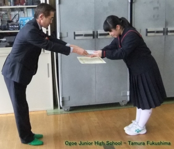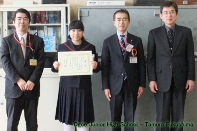 本校3年の小泉さんが全国で佳作に入選し、その表彰に大越郵便局長さんと三春郵便局長さんがお見えになり、校長室で表彰式を行いました。