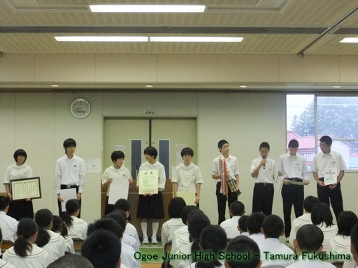 1校時に行われた始業式では、校長先生からの式辞に続き、宗像真由さん(1年1組)、渡辺祥希君(2年2組)、佐藤杏莉さん(3年2組)から夏休みの思い出や反省、そして2学期の抱負の発表がありました。また、式では夏休み中に行われたバスケットボールや野球の大会、合唱や少年の主張コンクールの受賞者による受賞報告も行いました。