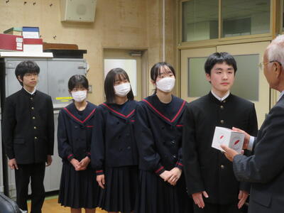 11月29日(金)の放課後、田村市社会福祉協議会の方々にお越しいただき、会長の助川様に生徒代表から「赤い羽根共同募金」をお渡ししました。募金額は5,392円でした。ご協力ありがとうございました。