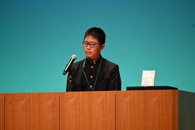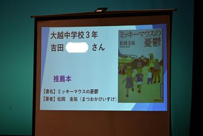 本校からは、3年生の吉田君が大越中学校代表として参加しました。紹介した本は「ミッキーマウスの憂鬱」でしたが、校内大会よりさらに工夫を加え、ユーモアも交えながらオーディエンスたちの気持ちをつかんでいました。