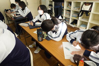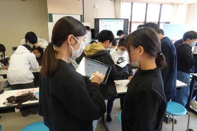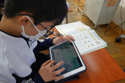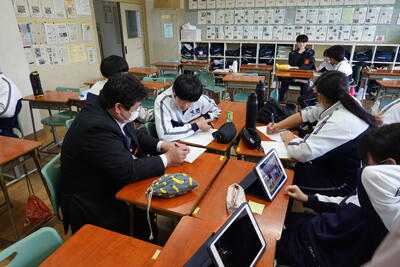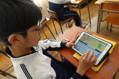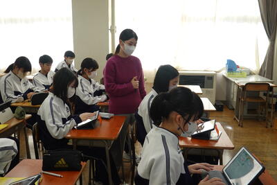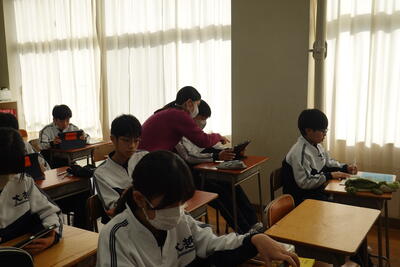 1年生の英語では、世界的な問題や地域の問題について、その現状や自分の考えを伝えるポスター作成に取り組みました。生徒たちは、環境問題や災害等に目を向け、それぞれタブレットを使って英文でまとめていました。