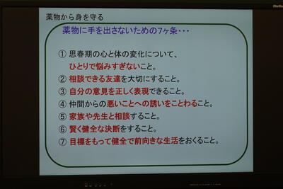 本日、講師として学校薬剤師の佐藤様にお世話になり、2学年を対象に薬物乱用防止教室を開催しました。今回は、薬物について正しい知識と得るとともに、その乱用を防ぐ観点から、「身の回りにある薬物」「薬物の害と心身・社会に及ぼす影響」「薬物から身を守る」等について、丁寧にお話ししていただきました。生徒たちは、メモをとりながら集中して話を聞いていました。薬物に手を出さないための7ヶ条をしっかり意識して生活していきましょう!
