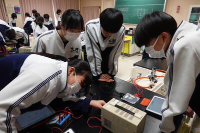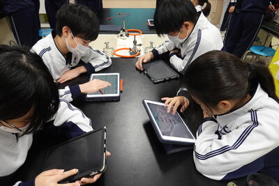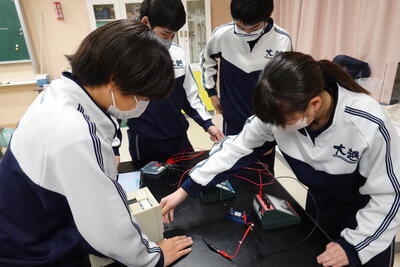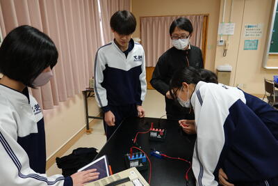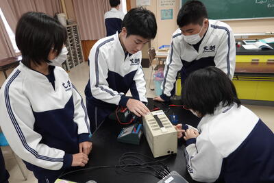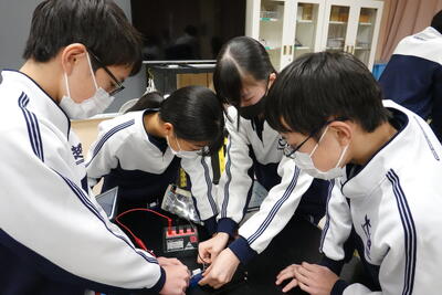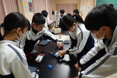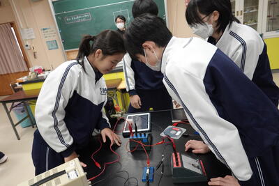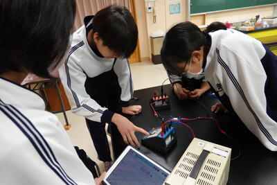 2年生の理科では、抵抗器に加わる電圧を変化させたときの電流の大きさを測定し、電圧と電流の関係を調べる実験を行いました。生徒たちは、班で協力しながら手際よく実験を行い、結果を記録していました。その後、実験した結果をグラフにしたことで気が付いたことを考察としてまとめました。