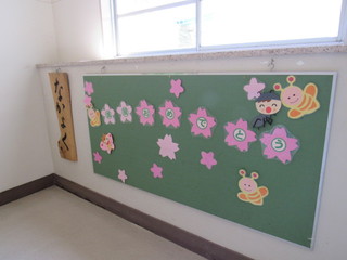 西階段の1階から2階への踊り場の掲示です。児童みんなのこころがなごみ、なかよくなります。
