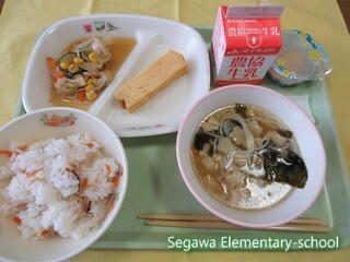 ちらしずし、厚焼き卵、天の川サラダ(星形のオクラ付き)、七夕汁(星形の麩と天の川のようなそうめん付き)、七夕ゼリー、牛乳です。