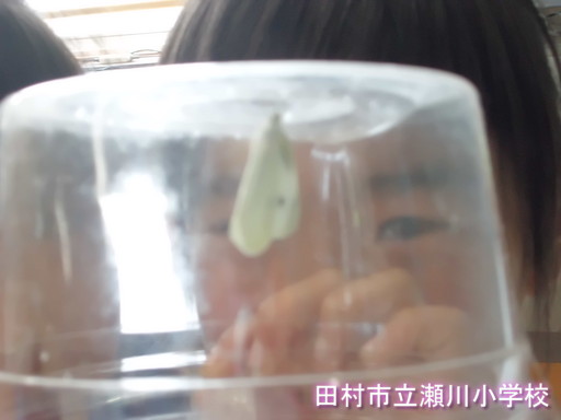 2校時目の始まりのチャイムが鳴り始めた時、3年生教室前を通ると、一生懸命先生にあることを伝える子どもたちがいました。それは、「アオムシがモンシロチョウに羽化した」ということです。タマゴから育ててきた子どもたちにとって、それは、大事件です。近くにいた私も教室の仲間に入りました。モンシロチョウのえさのとり方を観察するそうです。その後、どうするのか聞いてみました。そうすると、「観察した後逃がす」とのことでした。命の大切さをしっかり分かっているなと感心しました。自由になったモンシロチョウは、また、タマゴを産み、命が繋がって行くことを話しました。