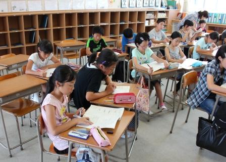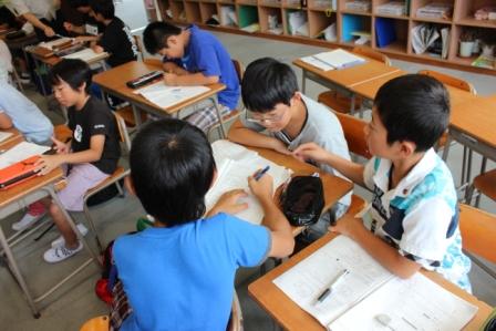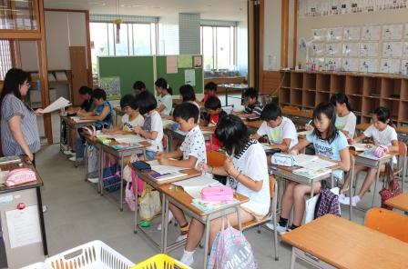7月29日(火)から31日(木)まで行われていた「田村市小学生サマースクール『先輩から学ぼう』」が終了しました。本校児童8名は3クラスに分かれて、船引小・美山小・瀬川小の子どもたちと一緒に楽しく学習することができました。最終日、最後の授業は「まとめのテスト」です。このテスト問題は、過去の全国学力学習状況調査問題で構成されており、県の課題になっている問題が中心です。今日のテストでも、「赤いテープの長さは120cm、赤いテープの長さは白いテープの長さの0.6倍です。」長さの関係を正しく表している図を選ぶ問題ができませんでした。数量の関係(基準量・比較量・割合)をとらえることができるようにするために、文章からわかることを順序よく図に表す学習活動を取り入れたり、数量の関係を表した図を変えると問題場面がどのように変わるかについて考えたりする学習活動を取り入れたりすることが必要と感じました。子どもたち一人一人、3日間よく考えて問題を解いていました。できなかった問題は夏休みで復習するようにしたいですね。頑張れ!5年生。多くの先生方にお世話になった「サマースクール」。「ありがとう」の感謝の心も忘れてはいけません。