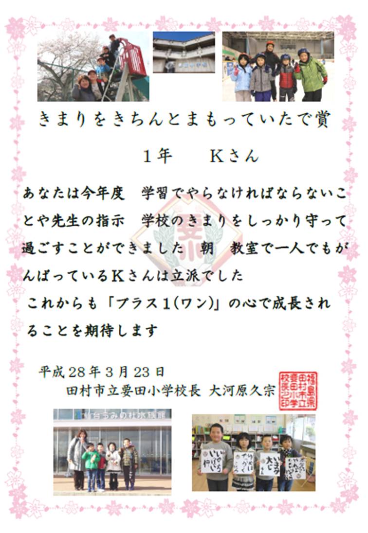 ○1年:Kさん…「きまりをきちんとまもっていたで賞」