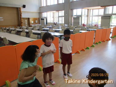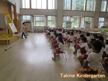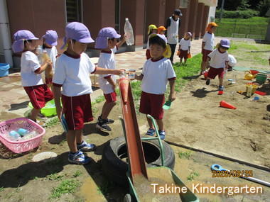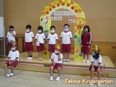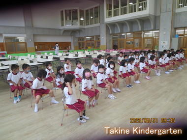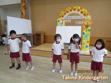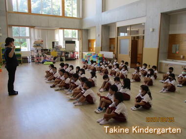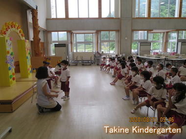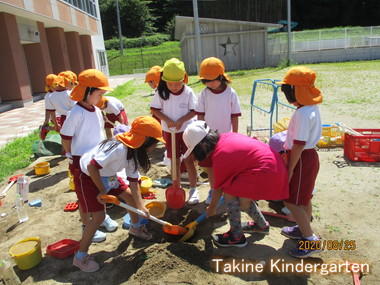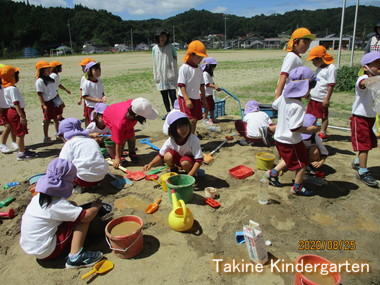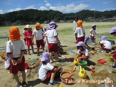 夏休みが終わり、本日より幼稚園を再開いたしました。幼稚園には、元気な声が響き渡っております。今日は夏休みの思い出集会が行われ、代表のお友だちが思い出を発表してくれました。戸外では、新しい砂場での泥んこ遊びやケーキ作りを楽しんでいました。