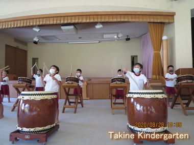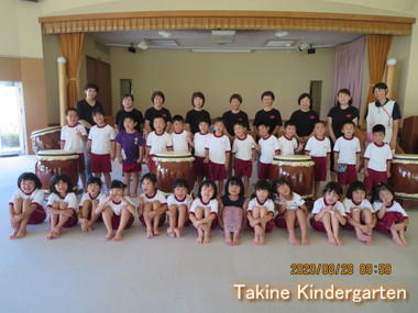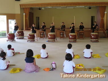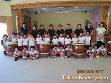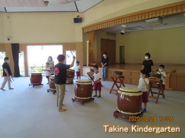 紅組さんの演奏を聞かせていただきました。体中に響く太鼓の音に子ども達は驚きと真剣な眼差しで見ていました。そして、子ども達の練習が始まりました。実際に太鼓に触れることでますます興味を示し、掛け声をかけながら楽しく太鼓を叩いていました。