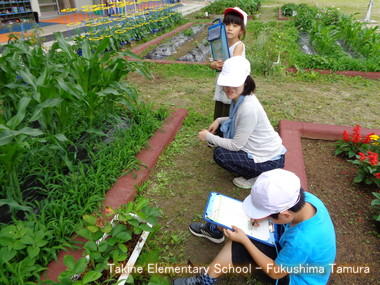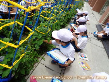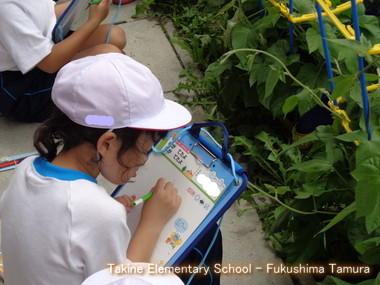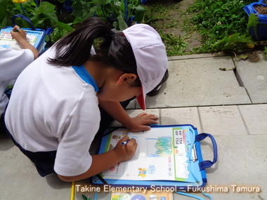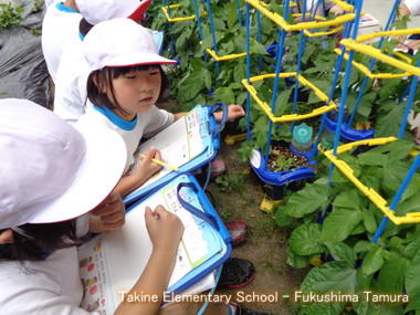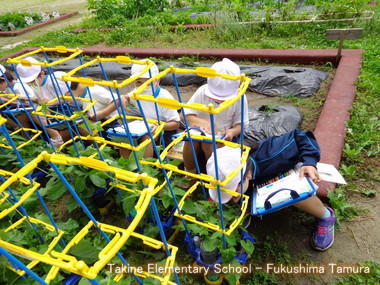 2年生が、生活科で育てている野菜などの観察をしていました。育ち方、葉の形や大きさなど、野菜の種類によって違っています。よく観察してスケッチしていました。大きく育ってたくさん収穫できるといいですね。