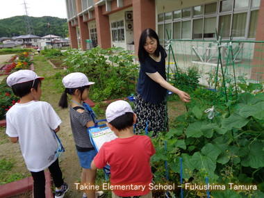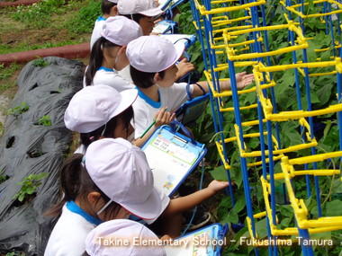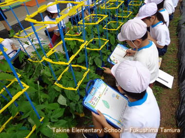 2年生が育てているミニトマト、きゅうりが収穫できるまでに大きく育ちました。
