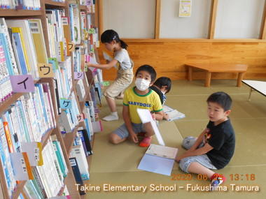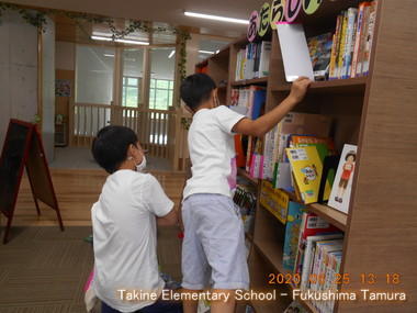 少し前の写真ですが、図書室での本の貸し出しの様子です。これらの写真は、子どもたちが週末読書に向けて図書室に本を借りに来ている様子です。木曜日の昼休みは1・2年生への貸出日です。学校の図書室には、いろいろな種類の本がたくさんあります。どんどん借りてたくさんの本に出合ってほしいと思います。