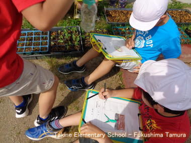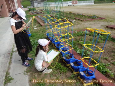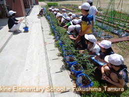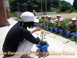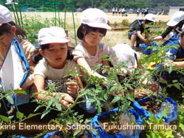 2年生が生活科で育てているミニトマトの「脇芽欠き」をしました。「脇芽」とは、幹と太い枝の分かれ目から生える細い枝のことです。そのまま伸ばしていると枝葉が茂りすぎてしまい、そのために栄養を使われ、実がつきにくくなります。また、湿度が高くなるとともに病気や害虫の被害にあいやすくなります。どれが脇芽かを教わって、慎重に脇芽を取っていました。