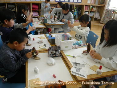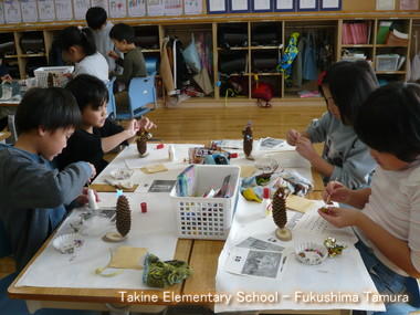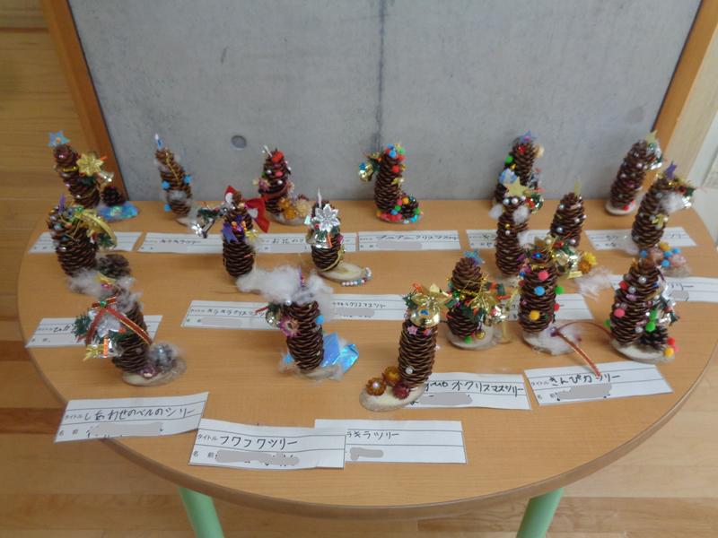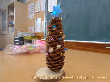 普段,図書支援ボランティアなどに来て下くださる箭内様に教えていただきながら,2年生が松ぼっくりのクリスマスツリー作りに挑みました。一心不乱に集中して飾りつけをして,素敵なツリーを完成させました。