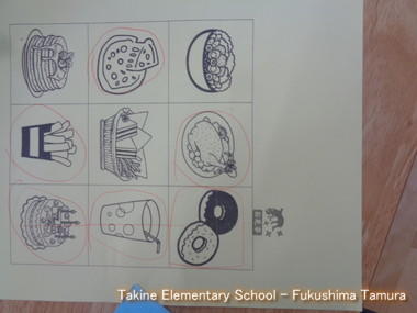 1年生が外国語の学習をしました。初めに英語指導助手(ALT)の発音を聞き,それぞれの単語の発音を真似て発声しながら覚えました。発音を覚えたら,早速ビンゴゲームです。ALTの発する言葉を聞き取ってカードに丸を付けます。後は,列がそろったらビンゴ!楽しく活動できました。