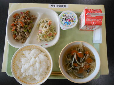 酢飯、五目ご飯の具、切干大根のマヨサラダ、若竹汁、牛乳