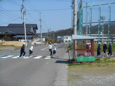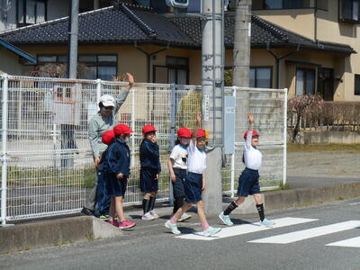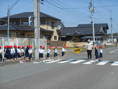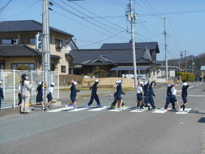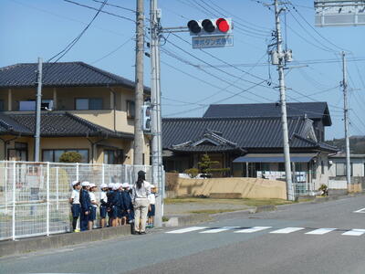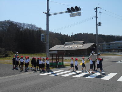 <低学年> 実際に歩道を歩き、横断歩道を渡る練習をしました。