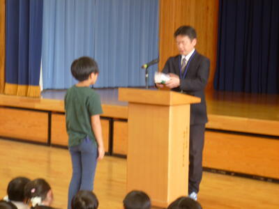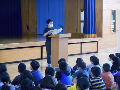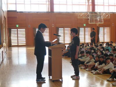 代表児童が「人のために役立つことをします」という誓いの言葉を