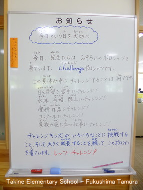 学校教育目標の重点キーワードである「チャレンジ」を染め抜いた教職員お揃いのTシャツを着て講話をした夏休み前集会の内容を書いています。