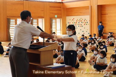 続いて、「田村市小学校水泳記録10傑」で3位以内に入った5・6年生に「金・銀・銅メダル」を渡しました。今年は、金メダルが2人、銀メダルが5人、銅メダルが6人でした。