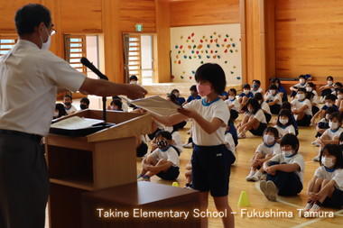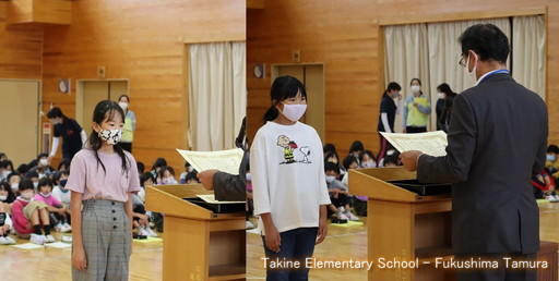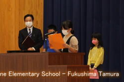 本日の全校集会において田村地区読書感想文コンクールでの入賞者の表彰を行いました。2名が特選、4名が準特選、1名が入選という結果で、代表として特選に輝いた2人に賞状を伝達しました。これからも読書を通して心を豊かにしていってほしいと思います。