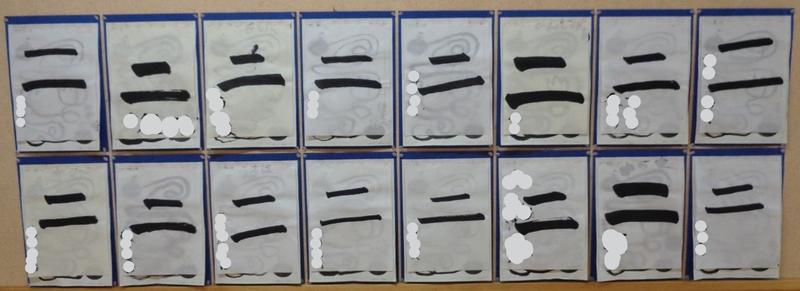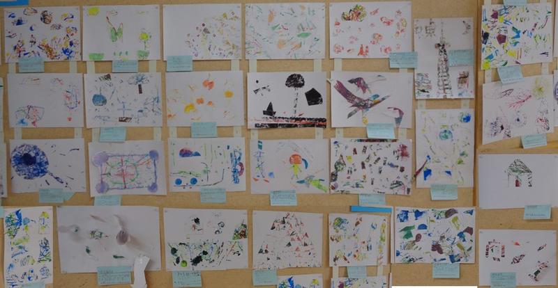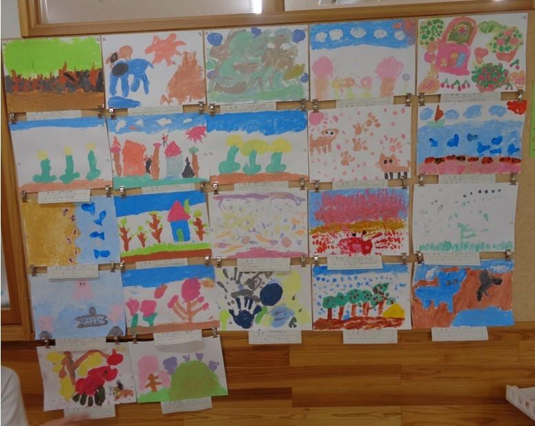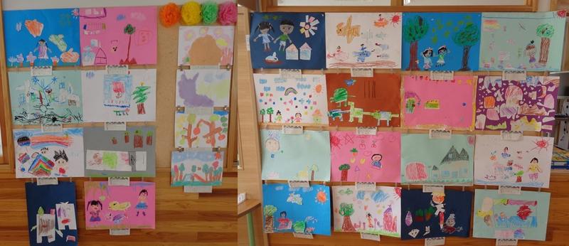 ※写真は切ったり張ったりして加工していますので大きさがそろっておらず見づらいかと思います。また、全員の作品がそろっていない学年もあります。ご容赦願います。