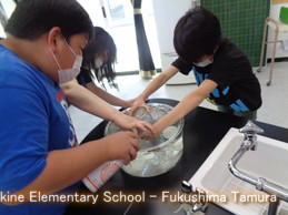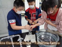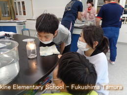 1組は理科の授業でした。「ものの燃え方と空気」という単元で、ものを燃やす働きがある気体は何かを実験で調べていました。ろうそくを集気瓶の中に入れると、ろうそくが激しく燃えたり、一瞬で炎が消えたり。子どもたちは驚きの目で科学の不思議を感じていました。