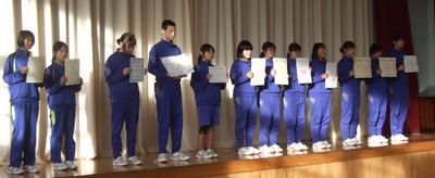 本日、第2回の全校集会を行いました。多くの生徒の表彰を祝うとともに、校長から、今月末の後期中間テストに向けて「不断」「雨だれ石を穿つ」「牛の歩みも千里」ということわざから、日頃の努力の積み重ねの大切さについて、話をしました。