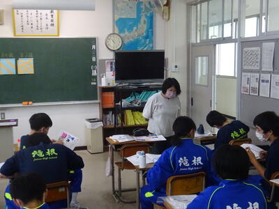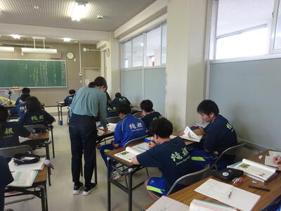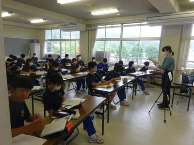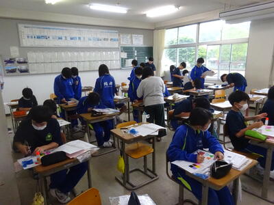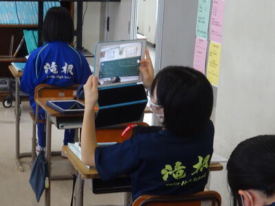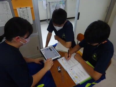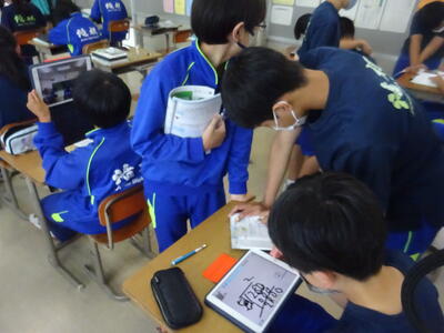 また、2年生では理科の授業でワークブックの問題や、黒板に書かれた問題に取り組んでいました。教科担任から問題のレベルについても説明があり、自分に合った問題に取り組んでいました。生徒の中には、黒板に書かれた難しい問題も念のために写真に撮ったり、近くの生徒同士で一緒に問題について考え合ったりする姿もありました。問題の解き方も生徒それぞれで、タブレットを使って回答を書き込む生徒、ノートに回答を書き込む生徒と、自分に合った使い方をしていました。学びを深めようとする積極的な姿勢はすばらしいと感じました。