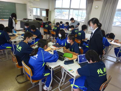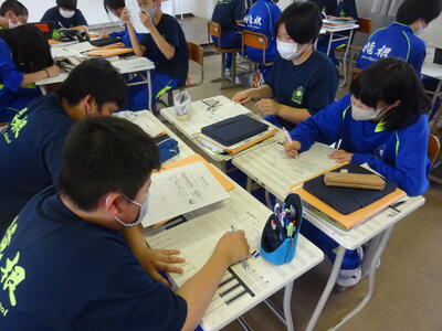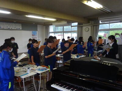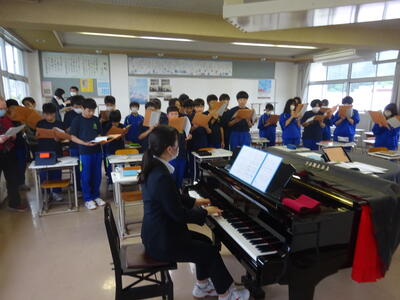 2023年6月23日 07時55分音楽科のA.S先生が初めての授業研究会を行いました。1年生での授業です。ねらいは、教科教材「夏の思い出」の曲想や強弱を生かして、歌唱表現を工夫するというものでした。本時のめあてを確認した後、生徒たちは課題と示された部分について、個人としてどう歌うかを考えグループ内で考えの交流を行いました。出された考えはグループとして発表され、最後に生徒それぞれが自分なりに工夫した歌唱表現で「夏の思い出」を歌いました。本時の活動により生徒たちの歌唱表現が変わり、それぞれの工夫が表れた歌唱となっていました。授業を行ったA先生と1年生の子どもたちの信頼関係が表れた授業でした。