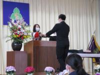 各学年代表の生徒が登壇し、学校長より修了証書を授与されました。品格を感じさせる二人の所作は、心身ともに成長したこの1年間の学びの証を示しているかのようでした。