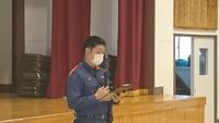 この日は滝根分署から消防隊員の方に来校していただき、生徒たちの様子を指導していただきました。落ち着いて避難できたこと、煙がある場合には姿勢を低くすること、そして、コロナ対策でマスクを着用している場合でも、(呼吸を確保できる程度に)ハンカチなどを軽く添えるように助言をいただきました。中学生になると、避難訓練に対する「慣れ」が出てくるので、今日のように気を引き締め、自分事として捉えてほしいという的確なアドバイスもいただきました。
