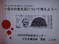 今回は、田村市給食センターから、主任栄養技師の菅野こふみ 様を講師として招き、専門的な知識と最新の情報を基に、わかりやすくお話をいただきました。講話では、「バランスのとれた体づくりのために~自分の食生活について考えよう~」と題し、「栄養のバランスを考え、3食しっかりと食べること」「消費するエネルギー量と摂取するカロリー量を考えること」「調査の結果から、毎日朝食をとる子どもほど正答率が高い、そして、毎日朝食をとる子どもほど(体力テストの)合計点が高いこと」などのお話をしていただきました。