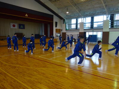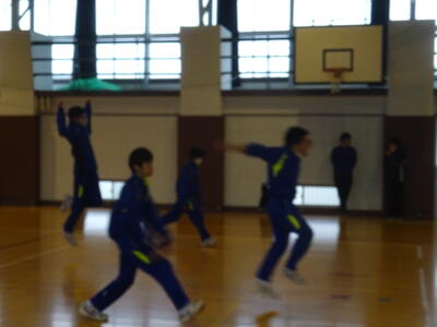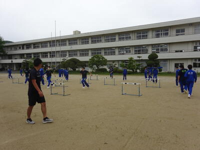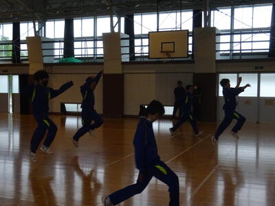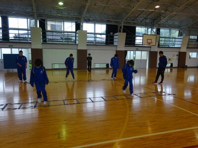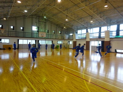 雨の月曜日となりましたが、本日から普段の教育活動が再開しました。特設陸上部の生徒たちは元気に登校し、本校の体育館で練習を行いました。