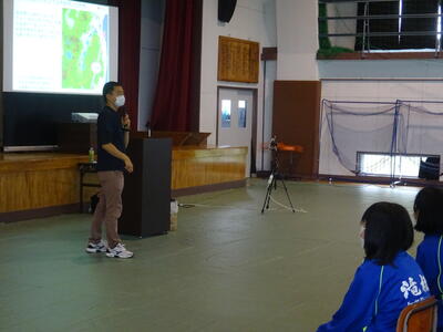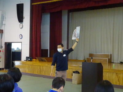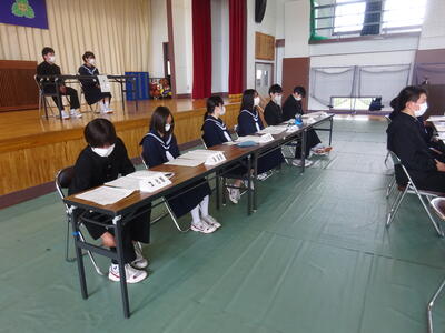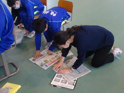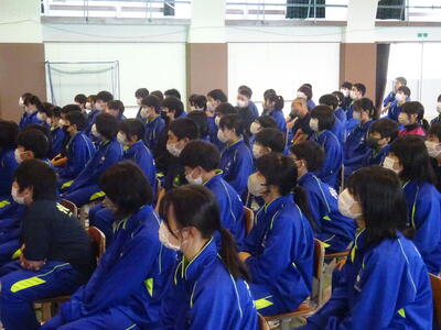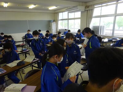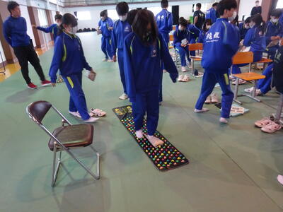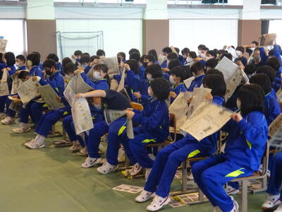 講話では、講師の方から災害に遭わないために安全な場所へ早めに非難すること、命を守るために様々な方法で情報を得ること、命を守るための方法などについてお話しいただきました。最後に災害時に避難所で起こることについて教えていただき、新聞紙2枚でできるスリッパの作り方を生徒全員で作ってみました。作ったスリッパででこぼこの部分を歩いてみても痛くないものでした。非常時にしか使わないものではありますが、生徒たちにとって貴重な学習となりました。