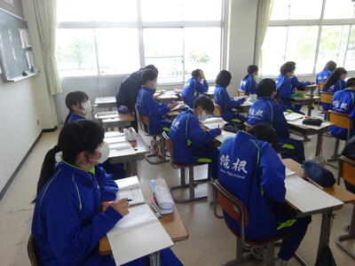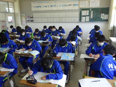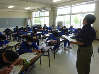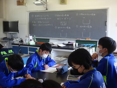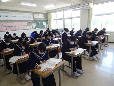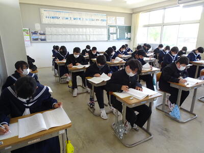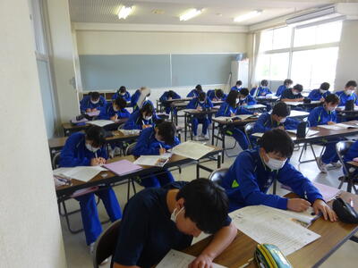 連休後も各学年の生徒たちは一生懸命に学習に取り組んでいます。3年生の理科の授業では、課題に対して真剣に向き合いながら、既習の学習内容を振り返っていました。
