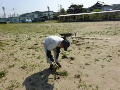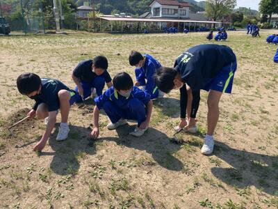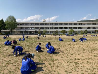 本日放課後、全校生で校庭の除草作業を行いました。連休中の雨で校庭はかなり雑草が多くなってしまいましたが、タンポポを中心に草削りで根を掘り出したり、手で抜けるものは引き抜いたりしました。生徒たちも短時間で効率よく除草を行っていました。