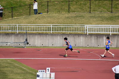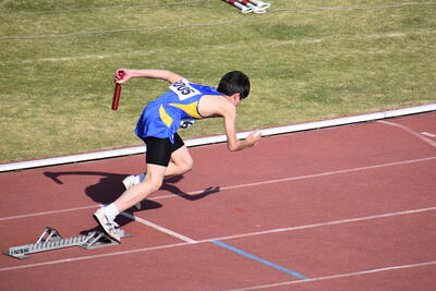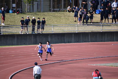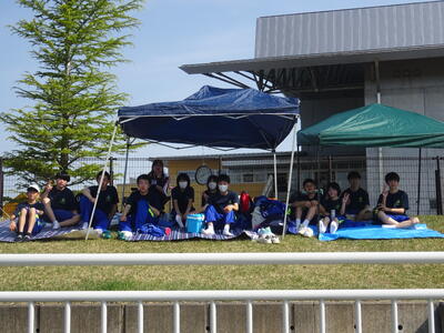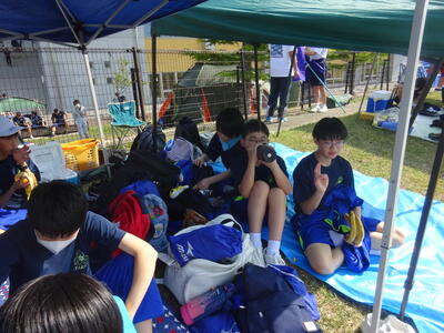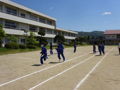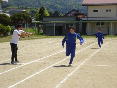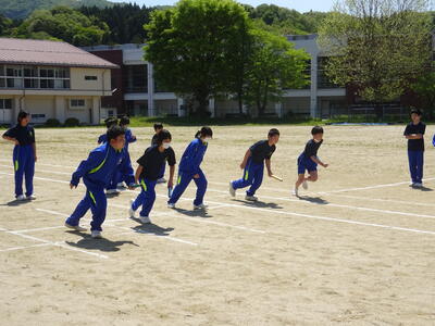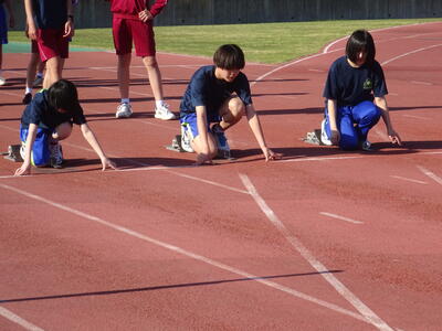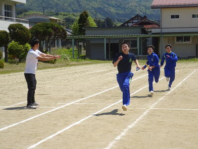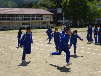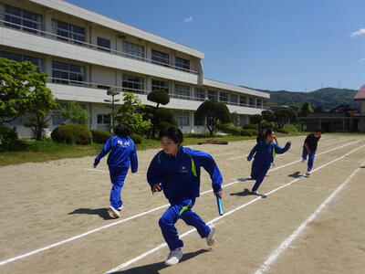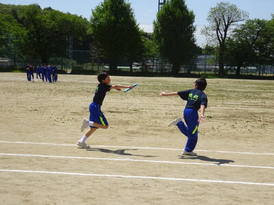 快晴の中、1年生は陸上競技でリレーを行っていました。校庭のトラックでリレーゾーンを使ってのリレーです。仲間に声援を送りながら一生懸命に走っていました。